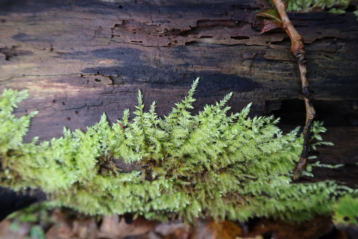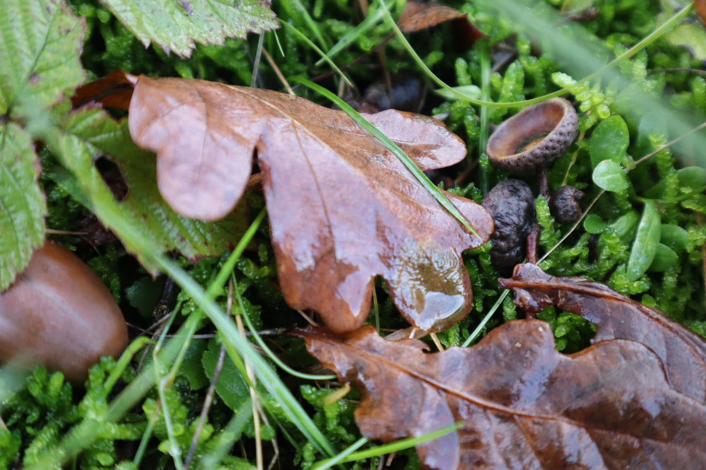 Het doet met terugdenken aan een fascinerend boek van ecoloog Robin Wall Kimmerer waarin ze haar liefde voor mos beschrijft. Helaas ben ik alle mos-namen sindsdien weer vergeten, en weet ik ter plekke weinig meer te vertellen over mos. Wat me vooral is bijgebleven is hoe zij mossen als miniatuurwerelden beschrijft. Vanuit het perspectief van de minuscule waterberen zijn mossen bossen. Wie de tijd neemt - en beschikt over een vergrootglas en wat verbeelding - wordt beloond. In haar woorden:
